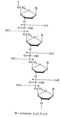 Таким образом, было убедительно доказано, что в ДНК межнуклеотидная связь осуществляется за счет фосфатной группы, а также 3'- и 5'-гидроксильных групп нуклеозидных остатков [(а) и (б) — направления расщепления полинуклеотидной цепи ДНК фосфодиэстеразами соответственно змеиного яда и селезенки или микрококков]: