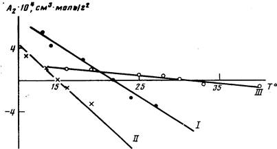 Таким образом, полученные результаты показали, что изменение строения элементарного звена полимера влияет на процесс растворения, а следовательно, должно отразиться и на термодинамических параметрах растворов. Воспользовавшись температурной зависимостью второго ви-риального коэффициента А2, оценили энтропийный и энтальпийный вклады в энергию взаимодействия полимер — растворитель. Согласно Флори [9], при температурах, близких к 6, справедлива следующая зависимость: