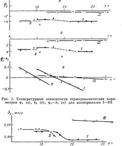 На рис. 2 представлены температурные зависимости параметров гр±, А-ч и разности г|)1—к,. Полученные данные показали, что процесс растворения всех трех полимеров протекает экзотермически (Ач<0) и сопровождается возникновением ориентации молекул растворителя около молекул полимера (i|)i<0). Нужно учесть, что донорно-акцепторные связи указанного выше типа не относятся к числу слабых. В области, близкой к 6-темпера-туре, наблюдается разброс экспериментальных значений и kt как для нефракционированных образцов I и II (рис. 2), так и для фракций. Для всех трех систем характерно уменьшение разности к С) с ростом температуры, что отражает ухудшение термодинамического качества растворителя при нагревании. На рис. 2, а, б обращает на себя внимание следующий факт: в области температур ниже 8 значения ifi и ki для всех систем остаются практически постоянными, причем для полимера III это постоянство сохраняется во всей исследованной температурной области.