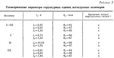 Следующей задачей нашего исследования было выяснение влияния изменения строения элементарного звена полимера на конформации макромолекул в растворе. Вначале методом машинного эксперимента на ЭВМ проведено моделирование макромолекулярного клубка методом Монте-Карло по программе, описанной в работе [11]. Структурные единицы полиарилатов моделированы на основании литературных данных о строении простейших молекул, близких по составу и строению к мономерным звеньям [12]. В табл. 2 приведены длины виртуальных связей углы между ними и указана возможность свободного вращения вокруг виртуальных связей, 8-угол дополнительный к углу между виртуальными связями. Вращение вокруг связи С—О запрещено, потому что эта связь считается полу торной, так как ее длина меньше суммы ковалентных радиусов углерода и кислорода.