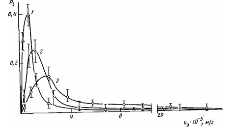 Рис. 2. Кривые распределения микротрещин по линейным скоростям роста при деформировании ПЭТФ в этиловом спирте со скоростью 8,33-10~6 (1), 3,33-10-5 (2) и 1,67-10-4 м/с (3)