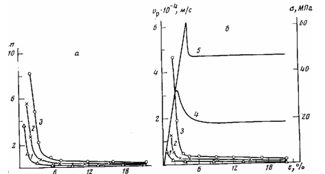 Рис. 3. Зависимость числа возникающих микротрещин п (а), их линейной скорости роста и напряжения (б) от величины деформации при растяжении ПЭТФ в этиловом спирте со скоростью 8,3310-6 (1); З.ЗЗ-10-5 (2); 1,67-10~4 (3); 1,5810-' (4) и на воздухе со скоростью 1,58-10-4 м/с (5)