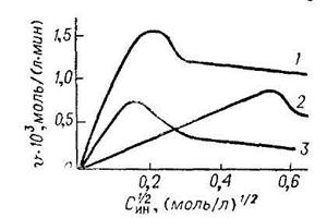 Зависимость скорости от продолжительности полимеризации характеризуется небольшим нестационарным участком, после чего она остается постоянной до значительной степени превращения мономера. На стационарном участке во всем изученном интервале температур сохраняется линейная зависимость скорости от концентрации ТФЭ. Зависимость скорости полимеризации от концентрации инициатора носит сложный характер (рис. 1). При невысокой концентрации инициатора (до максимума на кривых) наблюдается линейная зависимость v от Син. Для этих концентраций инициатора получены выражения для общей скорости полимеризации и констант роста и обрыва цепи, в л/(моль·с):