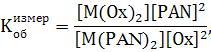 приведенные в таблице 4, измерены следующим образом. По светопоглощению комплексов с PAN определяли их концентрацию и вычитанием ее с общей концентрации металла находили концентрацию M(Ox)2. Из начальных концентраций реагентов c(PAN) и c(Ox) находили их равновесные концентрации, учитывая расход на комплексообразование, и рассчитывали подставляя значения всех концентраций
