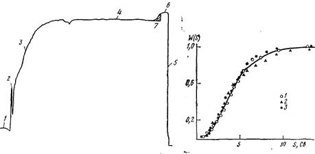 Цифрами обозначены участки поглощения, соответствующие воздуху в кювете (1), мениску (2), границе растворитель — раствор (3), раствору (плато) (4), реперному отверстию противовеса (5), промежутку между дном кюветы и реперным отверстием (б), микрогелю образца (заштрихованная область) (7). Время центрифугирования 30 мин после достижения скорости вращения 50 000 об/мин Рис. 2. Интегральные кривые W(S) распределения по коэффициентам седиментации для образцов I (1), II (2), III (3) ным по отношению к трактовке полимеризации таких бифункциональных мономеров, как олигоэфирметакрилаты [1, 2], олигокарбонатметакрилаты [21] или их сополимеризации с винильными мономерами [5]. Специфика подобных соединений состоит в большой активности функциональной двойной связи при присоединении к «своему» радикалу или в близких активностях каждой компоненты сомономеров. В этих случаях «зародыши» в виде частиц геля (глобулы) образуются на более ранних стадиях. Хотя наряду с глобулами иногда образуется растворимый полимер, но его или слишком мало, или невозможно выделить. Таким образом, при полимеризации (сополимеризации) полифункциональных олигомеров в массе возможны как минимум два механизма образования трехмерной сетки.
