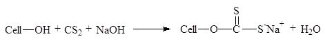 Исходным сырьем для производства является древесная целлюлоза, содержащая 95-99% высокомолекулярной целлюлозы со степенью полимеризации 800-1100. Ее обрабатывают 20%-ным раствором NaOH (мерсеризация) в течение 10 мин при 50оС. Полученную таким образом щелочную целлюлозу отделяют от лигнина и оставляют на созревание, при котором молекулярный вес целлюлозы уменьшается. Далее щелочную целлюлозу обрабатывают СS2 и получают ксантат целлюлозы: