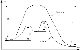 2) Катализатор непосредственно участвует в р-ях, образовывая промежуточные соединения, изменяя тем самым число и вид элементарных стадий процесса. Схематично можно представить так. Пусть для р-ии А+В=С+D катализатор является вещество К, тогда в присутствии катализатора схема может быть такой А+К→АК (а), АК+В=C+D+K (б). Р-ии (а) и (б) идут во много раз быстрее, чем р-ии непосредственного взаимодействия без катализатора. Промежуточное соединение в катализе это не обычное устойчивое хим. соединение, которое может быть выделено в чистом виде или может существовать в виде отдельной фазы. В гомогенном катализе это очень не стойкие соединения с малым временем жизни. В гетерогенном катализе это поверхностное соединение, не существующее в виде отдельной фазы, свойства которого резко отличаются от свойств аналогичного соединения образовывающего объёмную фазу.