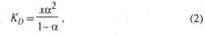 коэффициент активности недиссоциированной части электролита. Как и значение константы KD зависит от свойств растворенного вещества, в частности от прочности связи между фрагментами молекул электролита, образующими катион и анион, от диэлектрических свойств растворителя, его способности сольватировать ионы, а также от температуры и давления; в отличие от альфа не зависит от концентрации раствора. Константа KD может быть определена экспериментально, например, по зависимости электропроводности раствора от концентрации электролита или путем прямого измерения содержания свободных ионов в растворе, например, спектрофотометрическим методом.