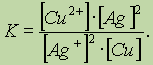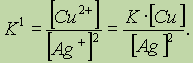 Обратите особое внимание на форму записи выражений для константы равновесия. Если концентрации некоторых реагентов существенно не изменяются в процессе реакции, то они не записываются в выражение для константы равновесия (такие константы обозначаются К1). Так, для реакции меди с серебром неправильным будет выражение