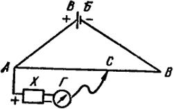 Передвигая контакт С по реохорду, находят такое положение, при котором нуль-гальванометр Г указывает отсутствие тока в цепи АХГС. Это означает, что падение потенциала от ВБ на отрезке АС полностью компенсирует э. д. с. элемента X.