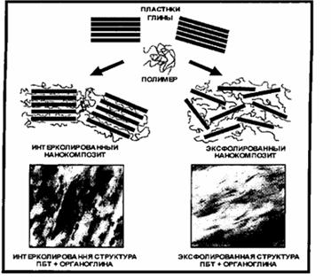 В зависимости от степени распределения частиц глины в полимере выделяют интеркалированную и эксфолиированную структуру нанокомпозитов (рис. 1.З.). Надо заметить, что хотя на рисунке пластинки глины показаны жесткими, на самом деле они обладают некоторой гибкостью. Формирование интеркалированной или эксфолиированной структуры зависит от многих факторов, например, от способа получения нанокомпозита, от природы глины и т.д. [48].