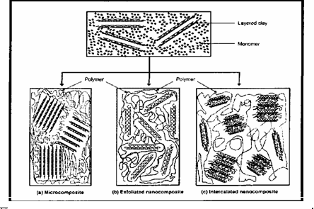 Рис. 1.4. Получение полимерного нанокомпозита в процессе синтеза самого полимера (in situ) (а) - микрокомпозит, (Ь) - эксфолированный (расше-лушенныи) нанокомпозит, (с) - интеркалированный нанокомпозит.