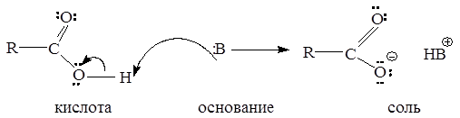 Карбоновые кислоты, как и спирты, способны образовывать водородные связи. Если акцептором является достаточно сильное основание, образование водородной связи предшествует полному переносу протона к основанию. В этом случае донор водородной связи считают «кислотой». Будет ли данное соединение «донором водородной связи» или «кислотой», зависит от природы «акцептора водородной связи» или «основания». Чем сильнее основание, тем больше вероятность того, что данное соединение будет вести себя по отношению к нему как кислота: