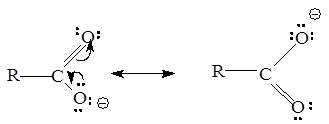 Карбоновые кислоты обладают более выраженными кислотными свойствами, чем спирты, из-за стабилизации карбоксилат-аниона, вызванной делокализацией p-электронов. Другими словами, карбоксилат-ион стабилизирован вследствие резонанса: