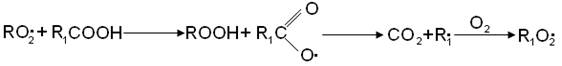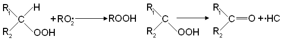 При цепном распаде вторичной гидроперекиси радикал R02• заменяется на свободный гидроксил: Реакция RO2• со спиртом приводит к образованию оксигидроперекисного радикала: Реакция с кислотами приводит к выделению СО2 и другому R1O2• радикалу: