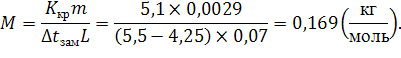 – величина, получаемая опытным путем – понижение точки замерзания раствора, состоящего из т кг растворенного неэлектролита и L кг растворителя; М – масса 1 моль неэлектролита, кг. Криоскопическая константа бензола Ккр = 5,1°.