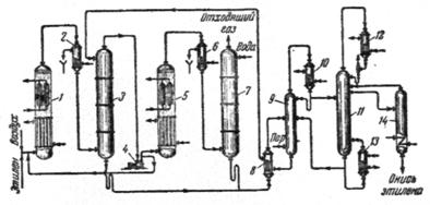 Из контактных газов после второй ступени окисления окись этилена извлекают водой в абсорбере 7 второй ступени. Из абсорберов 3 и 7 водный раствор окиси этилена через теплообменник 8 направляют в отпарную колонну 9. Отгоняемая из этой колонны паро-газовая смесь поступает через дефлегматор 10 на разделение в ректификационную колонну 11. Окончательная очистка окиси этилена от CO2 производится в колонне 14. Получаемый по этому способу продукт представляет собой 99,5%-ную окись этилена.