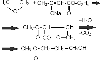 В растворе этанола при 0ºС окись этилена реагирует с натрийацетоуксусным эфиром. Образующийся при этом ацетобутиролактон в присутствии разбавленной серной кислоты дает