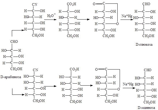 Синтез моносахаридов по методу Килиани-Фишера применяется для увеличения длины углеродной цепи альдозы на один атом углерода, в результате чего возникают две диастереомерные альдозы. Уже на первой стадии синтеза образуются изомерные циангидрины, дающие после гидролиза и декгидратации лактоны, которые восстанавливаются до альдоз, содержащих на один атом углерода больше, чем исходный моносахарид.