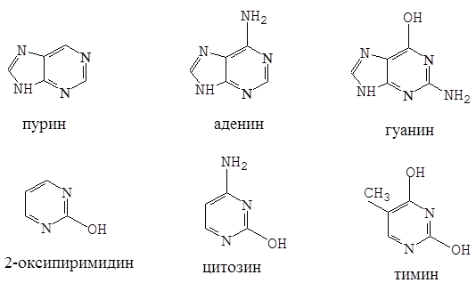 В состав ДНК и РНК входят не только остатки сахаров, но и различные основания, играющие важную роль в выполнении биологических функций нуклеиновых кислот. Эти основания представляют собой производные пиримидина и пурина.