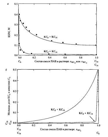 Зависимости KKM и состава мицелл от состава раствора для двух бинарных смесей калиевых мыл с разной длиной углеводородных цепей. Сплошные линии – результаты расчета по уравнениям и соответственно. С разрешения