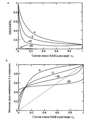 Рисунки 5.5, а, б показывают влияние возрастающих по модулю отрицательных значений параметра в на KKM и мицеллярный состав соответственно при соотношении KKM двух ПАВ, равном 0.1. При возрастании притяжения между молекулами ПАВ, т.е. когда в становится все более и более отрицательным, значение KKM смеси уменьшается. Значения в около -2 типичны для смесей анионных и неионных ПАВ. Значения в в интервале от -10 до -20 типичны для смесей анионных и катионных ПАВ. Из рис. следует, что по мере увеличения по модулю отрицательных значений параметра в состав смешанных мицелл стремится к соотношению 50: 50, что свидетельствует о преобладании электростатического притяжения между молекулами ПАВ разных типов.