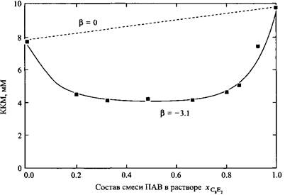 Зависимость KKM смеси додецилсульфата натрия с CsE4 от состава раствора. Пунктирная линия соответствует расчету KKM смеси при в = 0, сплошная линия – расчет KKM смеси по уравнению при в = -3.1. Результаты показывают, что при близких значениях KKM индивидуальных ПАВ предсказываемые значения KKM смеси сильно зависят от величины параметра взаимодействия