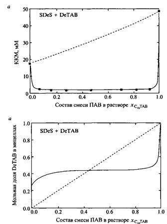 Зависимости KKM и состава мицелл смесей децилсульфата натрия и бромида децил-триметиламмония от состава раствора. Видно, что можно использовать комбинации анионного и катионного ПАВ для достижения очень высокой поверхностной активности