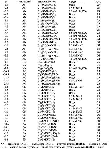 В таблице приведены значения параметра взаимодействия в для типичных смесей ПАВ. Можно отметить некоторые закономерности; например, для смесей неионных и ионных ПАВ значение в уменьшается с увеличением концентрации соли вследствие экранирования и уменьшения электростатического отталкивания. Кроме того, для смесей параметр в уменьшается по модулю с увеличением температуры, т.е. уменьшается притяжение между молекулами ПАВ разных типов.