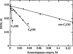 Существуют дифильные вещества, не способные к мицеллообразованию. Вместо этого при повышении концентрации происходит разделение систем на фазы. Хорошо известным примером таких веществ являются спирты с углеводородными радикалами средней длины. Концентрация, при которой происходит разделение на фазы, аналогична критической концентрации мицеллообразующих ПАВ. Следовательно, предельная растворимость таких спиртов может быть использована как «ККМ» спирта в воде для расчета KKM смесей спиртов с обычными ПАВ. На рис. представлены подобные результаты. Для смесей анионного ПАВ со спиртами приведены зависимости KKM ПАВ от концентрации спирта. Сплошные линии – расчет по уравнению с использованием значений растворимости спирта в качестве его «ККМ».