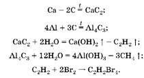 1. При прокаливании с углеродом без доступа воздуха (отсутствие кислорода) образуются только карбиды металлов, при обработке которых водой получаются метан и ацетилен. При пропускании этих газов через бромную воду с бромом реагирует только ацетилен, поэтому масса склянки увеличилась на массу ацетилена. Запишем уравнения реакций: