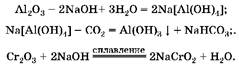 1. В концентрированном растворе щелочи растворяется только оксид алюминия с образованием комплексной соли. При пропускании углекислого газа через ее раствор эта соль разрушается и образуется гидроксид алюминия. Смесь хрома(Ш), который не растворился в растворе щелочи, при сплавлении с гидроксидом натрия образует хромит натрия: