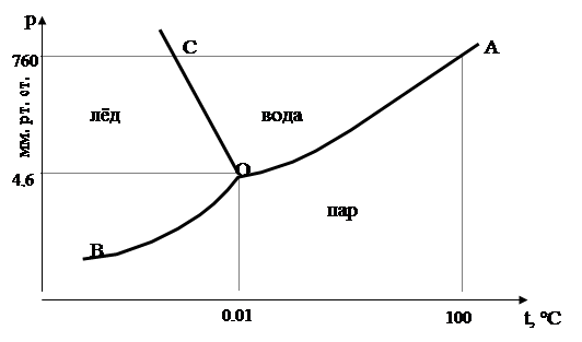 Показанная выше зависимость между давлением водяного пара и температурой, а также условия одновременного существования воды в различных фазах могут быть наглядно представлены при помощи диаграммы состояния воды. На этой диаграмме линия ОА представляет кривую давления паров воды, а линия ОВ – кривую давления паров льда. Точки кривой ОА показывают, при каких температурах и давлениях могут одновременно существовать в равновесии вода и пар; точки кривой ОВ определяют условия равновесия между льдом и паром. Обе кривые пересекаются в точке О, указывающей температуру и давление, при которых могут находиться в равновесии все три фазы.