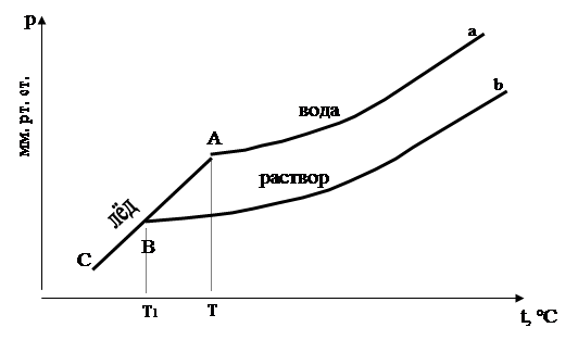 Поэтому точка О называется тройной точкой; ей отвечает давление 4,6 мм.рт.ст. и температура +0,01º С. Кривая ОС показывает влияние давления на точку плавления льда. Каждой её точке соответствует определённое давление и определённая температура, при которых лёд и вода находятся в равновесии. Однако для этого необходимо, чтобы давление пара твёрдой и жидкой фаз было одинаковым, иначе пар будет переходить от одной фазы к другой до полного исчезновения той из них, над которой давление пара больше. Одновременное существование льда и раствора будет возможно только при температуре ниже 0º С, и именно при такой, при которой давление их паров станет одинаковым. Другими словами, раствор будет замерзать при более низкой температуре, чем чистый растворитель. Все эти соотношения становятся особенно ясными, если изобразить их графически, начертив кривые изменения давления паров с температурой.