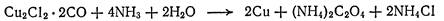 Образовавшееся нестойкое комплексное соединение Си2С12 • 2СО легко распадается на Си2С12 и СО, особенно при повышенной температуре. Чтобы ослабить этот распад, поглощение ведут в присутствии водного раствора аммиака, который реагируете комплексным соединением Сu2С12*2СО по реакции: