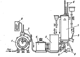 Установка (рис, 8) состоит из калориметра 7, газовых часов /, регулятора давления 4, горелки, напорного бака, технических весов и сборников воды.