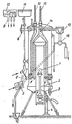 Во внутреннем цилиндре имеется камера где происходит сгорание топлива в газовой горелке 2. Продукты горения поступают вверх, а затем по трубкам опускаются вниз и через выхлопную трубу 6 выходят в атмосферу. На выхлопной трубе имеется термометр 7 со шкалой от 0 до 50 °С с ценой деления 1 °С и шибер 5, с помощью которого регулируется скорость газов, проходящих через калориметр. Между стенками цилиндра протекает вода, которая воспринимает теплоту отходящих газообразных продуктов сгорания, нагревается и собирается в сосуде. Степень нагрева воды контролируется двумя термометрами 12 и 13, поставленными на входе и выходе воды. Поступление воды из специального бака или водопровода регулируется распределительным устройством с краном 16, которое позволяет излишек воды направлять в канализацию. Снизу калориметр снабжен краном для сбора конденсата, образующегося при сгорании водорода и углеводородных газов.