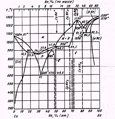 Кроме твердых растворов на основе чистых металлов компонентов в системе существуют следующие фазы: β, γ, δ. Фазе β иногда приписывают формулу Cu2 Be, а фазе γ — формулу СuВе, но чаще эти фазы рассматривают как упорядоченные твердые растворы Be в Сu с разной степенью упорядоченности. Фаза β имеет неупорядоченную ОЦК структуру, фаза γ обладает ОЦК структурой типа CsCl. Данные о структуре фазы δ неоднозначны. Структура фазы δ определялась как кубическая, так и гексагональная. Согласно некоторым данным в области существования фазы δ имеются два соединения: СuВе3 и СuВе2. Соединение СuВе3 имеет гексагональную структуру типа CuZn3. Соединение СuВе2 обладает кубической решеткой, изотипной MgCu2. Соединения должны быть разделены гетерогенной областью существования двух фаз (CuBe3 + CuBe2), но так как положение соответствующих фазовых границ точно не установлено, на диаграмме состояния эти области показаны штриховыми линиями. То, что соединение СuВе3 имеет гексагональную решетку, вызывает определенные сомнения, так как соединение CuZn3 в системе Сu—Zn обычно рассматривается как фаза δ, существующая только при повышенных температурах и имеющая ОЦК решетку типа CsCl. При температурах, близких к комнатной, составу Cu3Zn в системе Сu—Zn отвечает двухфазная смесь, состоящая из кубической фазы γ и гексагональной плотноупакованной фазы ε.