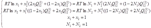 Обозначим через х мольные доли компонентов в α-фазе, а через N – мольные доли компонентов в γ-фазе, и учитывая условия нормировки их на единицу, можно систему уравнений (2.7) с учётом (1.3) и (1.6) переписать в следующем виде: