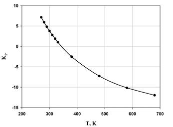 Из графика зависимости константы равновесия от температуры можно сделать вывод о том, что целесообразно проводить реакцию при низких температурах, поскольку при температуре 270 К константа равновесия принимает наибольшее значение, что говорит о сильном смещении равновесия в сторону образования продукта реакции (полимера).