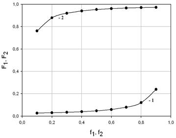 Пусть f1 – доля тетрафторэтилена, f2 – этилена в смеси мономеров. Зададим: f1 = 0,1; 0,2; 0,3; 0,4; 0,5; 0,6; 0,7; 0,8; 0,9 и, соответственно, f2 = 0,9; 0,8; 0,7; 0,6; 0,5; 0,4; 0,3; 0,2; 0,1.