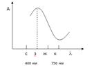 а) Выбор светофильтра. Для практического выбора светофильтра берут стандартный раствор максимальной концентрации. Измеряют абсорбционность (А) этого раствора на всех светофильтрах по отношению к холостому раствору. По полученным данным строят график в координатах: абсорбционность (А) – длина волны падающего света (λ).(см.рис.2.3.)