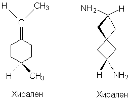 Если одну или обе двойные связи симметрично замещенного аллена заменить на циклическую систему, то полученные молекулы будут тоже обладать аксиальной хиральностью, например: