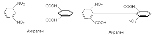 В бифенилах, содержащих четыре объемистые группы в орто-положениях, свободное вращение вокруг центральной связи затруднено из-за стерических препятствий, и поэтому два бензольных кольца не лежат в одной плоскости. По аналогии с алленами, если одно или оба бензольных кольца замещены симметрично, молекула ахиральна; хиральны же молекулы только с двумя несимметрично замещенными кольцами, например: