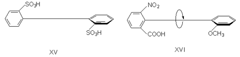 Иногда для предотвращения свободного вращения в бифенилах достаточно трех и даже двух объемистых заместителей в орто-положениях. Так, удалось разделить на энантиомеры бифенил-2,2-дисульфокислоту (XV). В соединении XVI свободное вращение полностью не заторможено, и, хотя его можно получить в оптически активной форме, при растворении в этаноле оно быстро рацемизуется (наполовину за 9 мин. при 250).
