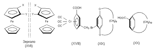 Для некоторых хиральных молекул определяющим структурным элементом является не центр, не ось, а плоскость. Простейшую модель планарной хиральности легко сконструировать из любой плоской фигуры, не имеющей осей симметрии, лежащих в этой плоскости, и отдельной точки вне плоскости. Наиболее изучены планарно-хиральные производные ферроцена (XVII). Другими примерами являются ареновые комплексы хромтрикарбонила (XVIII), а также соединения XIX и XX.