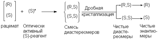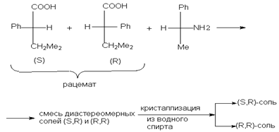 Этот метод до настоящего времени использовался наиболее часто. Если рацемическое соединение содержит карбоксильную группу, то можно получить соль с оптически активным основанием. Если же рацемат содержит аминогруппу, то можно получить соль с оптически активной кислотой. Допустим, что оптически активный реагент (в данном случае основание или кислота) имеет (S) - конфигурацию. Тогда образующиеся соли будут смесью (R) - и (S) - диастереомеров, и в отличие от энантиомеров их свойства будут уже различаться.