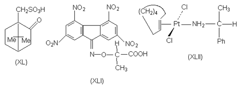 Диастереомеры могут образовываться не только в результате взаимодействий кислот и оснований Бренстеда, но также и в реакциях, в которых взаимодействуют кислоты и основания Льюиса. Так, при расщеплении ароматических соединений, в состав которых не входит ни кислотные, ни основные группировки (например, хиральных нафтиловых эфиров), может быть использована их способность образовывать p - комплексы с нитрофлуореном. Для этой цели используют реагент (XLI), в котором элекктроноакцепторные тетранитрофлуореноноксимная группа придает ей способность к комплексообразованию с электронодонорными ароматическими кольцами, а фрагмент энантиомерной молочной кислоты обеспечивает реагенту в целом оптическую активность. Другим примером является расщепление транс-циклооктена путем образования комплекса с солью двухвалентной платины (кислота Льюиса), вторым лигандом у которой является молекула (R) - a - фенилэтиламина (XLII).