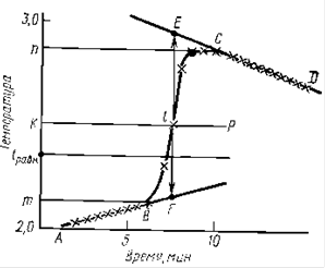 При графическом определении Dt на миллиметровой бумаге на оси абсцисс откладывают время в масштабе 1 мин = 1 см, на оси ординат — температуру, выбор масштаба которой зависит от величины Dt. При Dt£1° 1°=10 см; Dt³1° 1° — 5 см. После того как на график нанесены все экспериментальные точки, получается кривая ABCD. Участок АВ называется начальным периодом, ВС — главным, CD — конечным. Чтобы определить изменение температуры Dt, не искаженное теплообменом, происходящим в течение главного периода, продолжают АВ и CD до пересечения с вертикальной прямой EF. Для этого точки m и n, соответствующие начальной и конечной температурам главного периода, наносят на ось ординат. Через середину отрезка mn проводят линию КР. Пересечение этой линии с кривой ВС дает точку 1, определяющую положение прямой EF. Отрезок EF и будет равен Dt, отрезок mn=Dt`. Чем меньше температурный ход в начальном и конечном периодах, тем меньше потери теплоты за счет теплообмена и тем ближе Dt` к Dt. Если температурный ход содержимого калориметра при работающей мешалке равен нулю, то это состояние соответствует Dtравн. Характер линии ВС зависит от условий протекания теплового процесса (например, от размешивания), наклон линий АВ и CD зависит от характера теплообмена с окружающей средой. Таким образом, по виду кривой ABCD можно судить о качестве проведенного опыта.