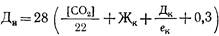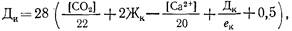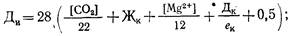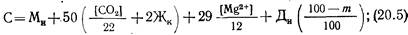 где [СО2] - концентрация в воде свободного оксида углерода (IV), мг/л; [Са2+] - концентрация ионов кальция, мг/л; Жк - карбонатная жесткость воды, мг-экв/л; Дк - доза коагулянта (FeS04 или FeCl3 в пересчете на безводные продукты), мг/л; ек - эквивалентная масса активного вещества коагулянта, мг/мг-экв (для FeS04 ек = 76, для FeCl3 ек = 54); 0,5 и 0,3 - избыток извести для обеспечения большей полноты реакции, мг-экв/л.